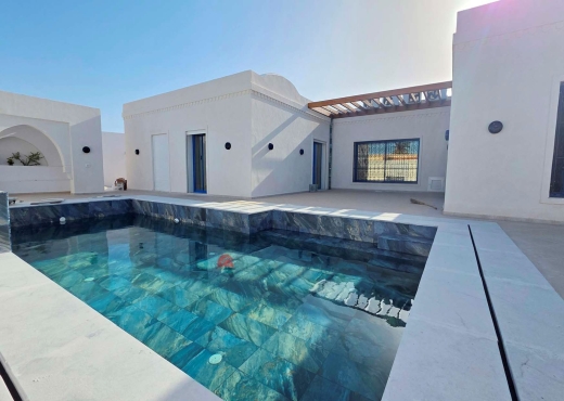 Votre agence visavis immobilier vous propose une villa titrée avec étage indépendant à Khazroun Djerba. Sur un terrain de 430 m² et couvre 173 m². Le rez de chaussée se compose d'un espace ouvert salon, salle à manger, cuisine, 3 chambres et un salle d'eau. Un bel espace extérieur entoure une piscine de 8x4 sans vis-à-vis Un étage avec entrée indépendante, se compose d'un espace lumineux salon, salle à manger et kitchenette, 1 chambre et 1 salle d'eau. 2 grandes terrasses dont 1 avec pergolas. Divers : Un studio de 30 m² à l’état - Citerne d'eau - Entrée voiture .... NB :Frais d'agence en plus